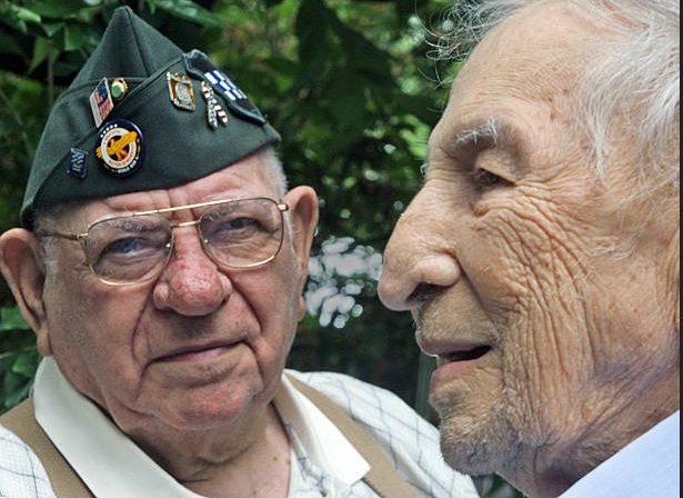 We are in July 2010. Kenneth Myers, former member of HQ Company 394th Infantry, is holding the hand of George Serkedakis, of Service Company, 394th infantry. Serkedakis, « Serkie » for his buddies, is hospitalized in a VA hospital near Washington, DC. Both men recalled the time during the Battle of the Bulge when Ken likewise held out a comforting hand to Serkie who had been bit by shrapnel.